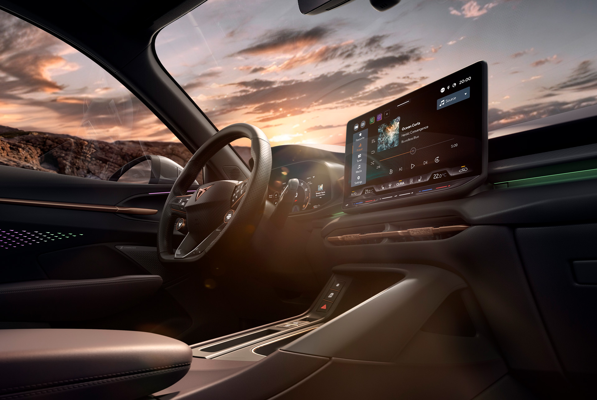 Aslında Cupra, balıkçılar ve yerel topluluklarla işbirliği içinde Akdeniz’den alınan tüm atık malzemeleri kullanan Seaqual şirketiyle bir anlaşma imzaladığından beri, koltuklarını üretmek için geri dönüştürülmüş polimer elyaf kumaşlar kullanıyor. Bu vesileyle ön koltuklara dönersek, aracın bütün işlevlerini üstlenen 12,9 inçlik multimedya monitörü, gelişmiş 3.0 yazılımıyla donatıldı.