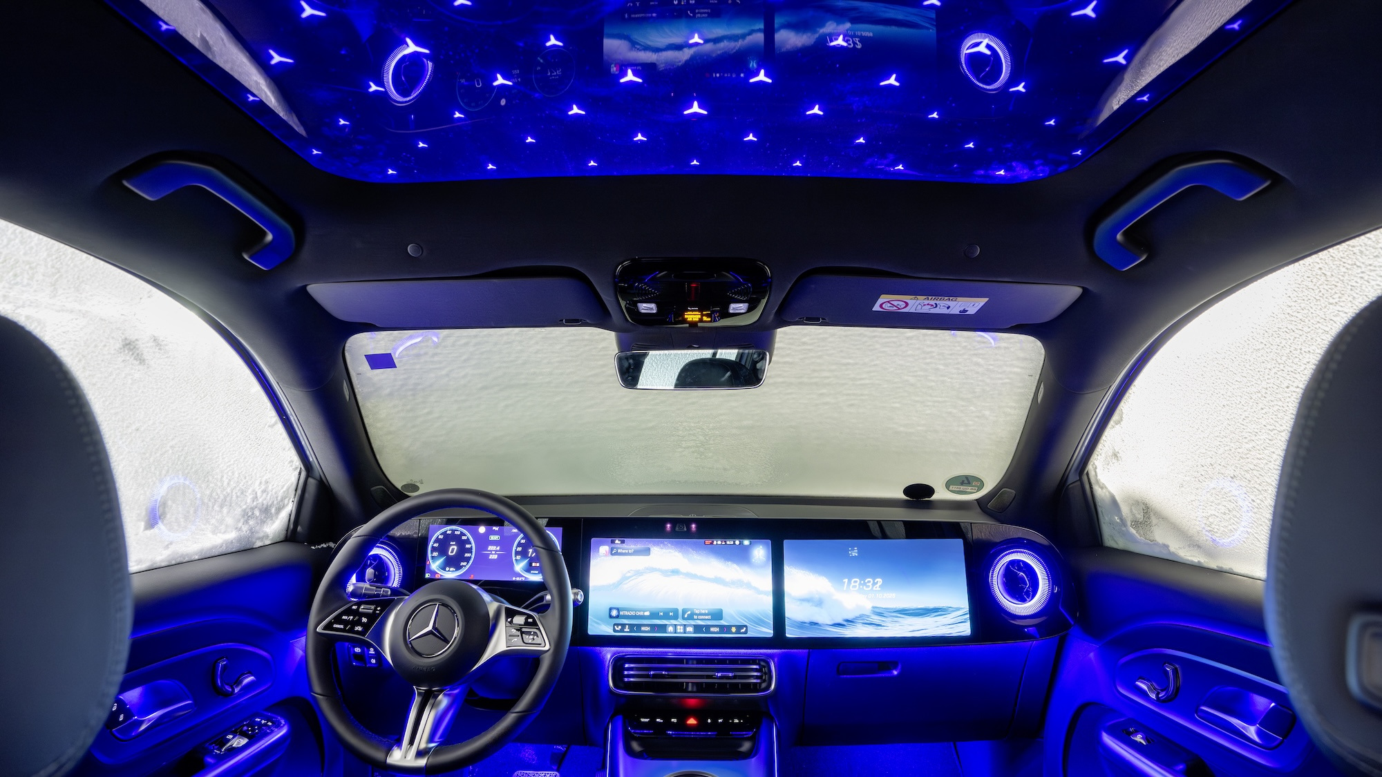 Mercedes, panoramik tavan teknolojisini de yeniledi. LowE kaplama yaz aylarında güneş ısısını dışarıda tutarken, kışın iç ısıyı geri yansıtıyor. Ayrıca tavan, 10–20 milisaniye içinde opal ve şeffaf modlar arasında geçiş yapıyor. Bunun yanında ambiyans aydınlatması “yıldızlı gökyüzü” efekti oluşturarak kabin atmosferini zenginleştiriyor.